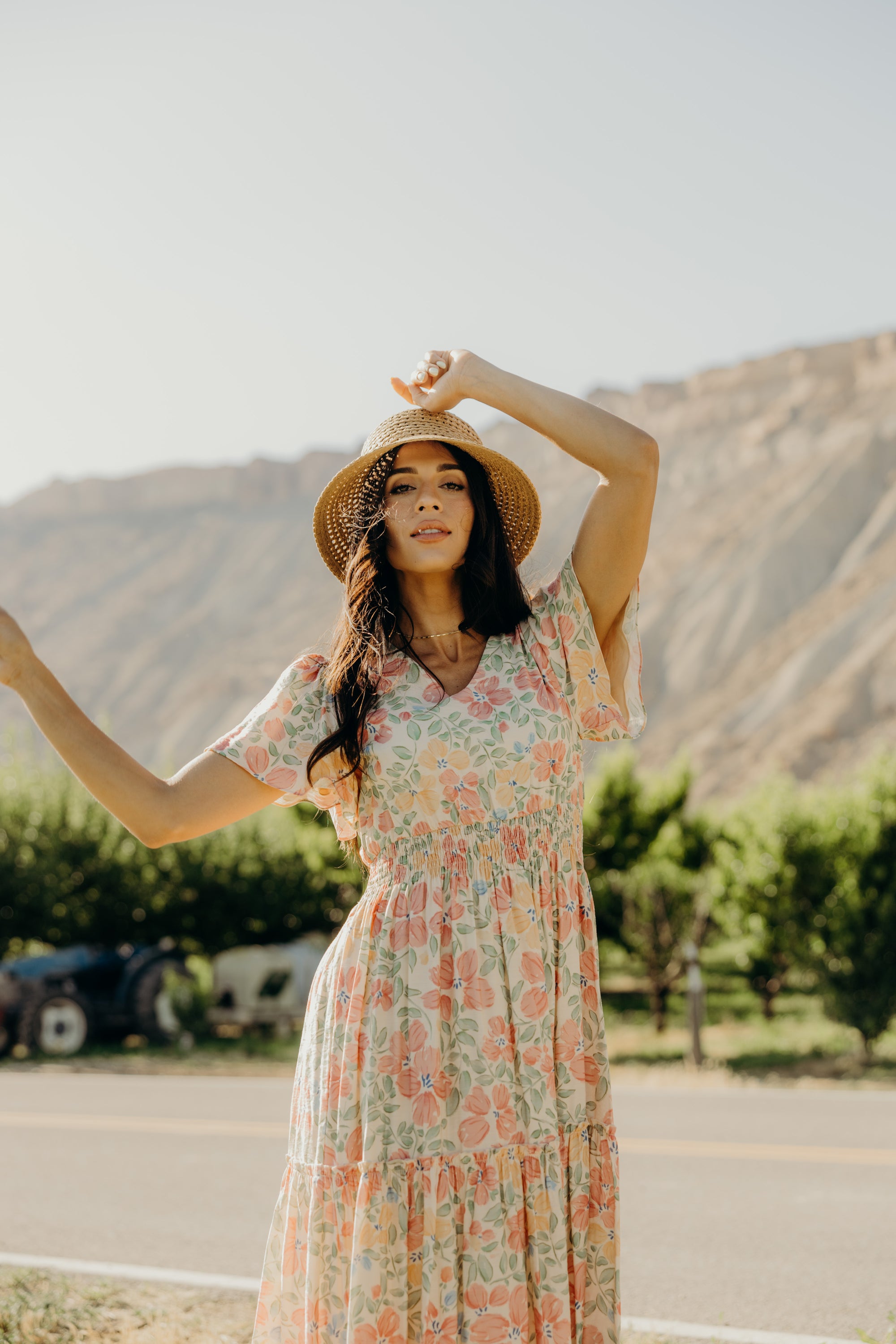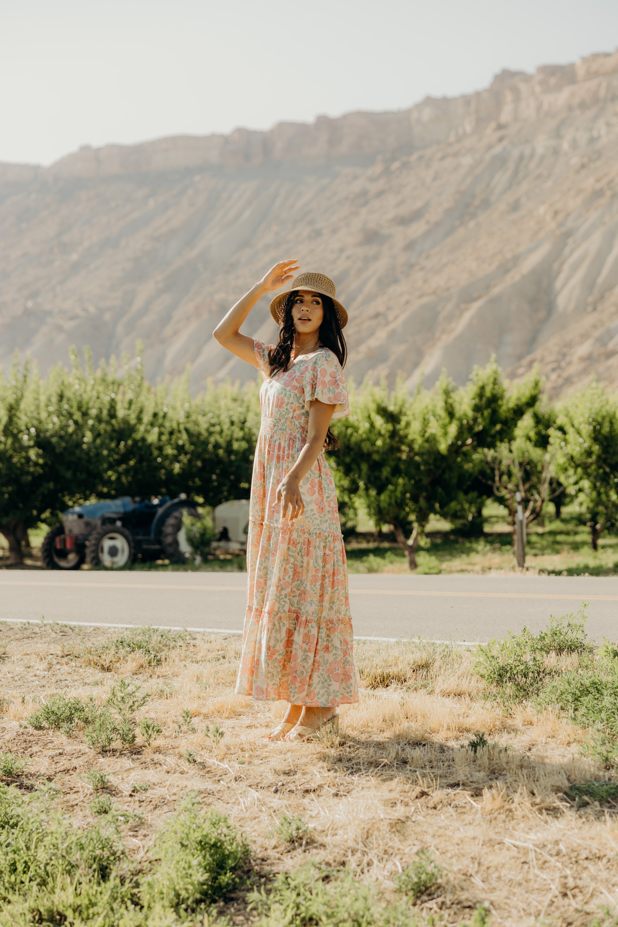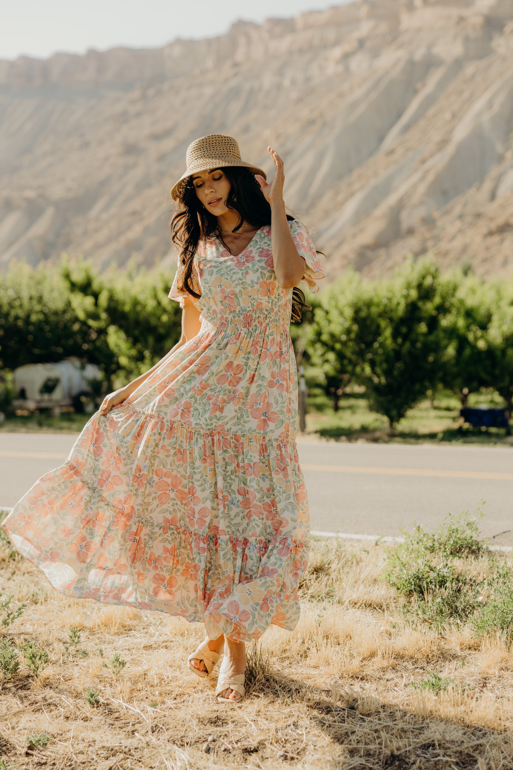Full-length dress with a tiered skirt, elastic waist, v-neckline and flutter sleeves.